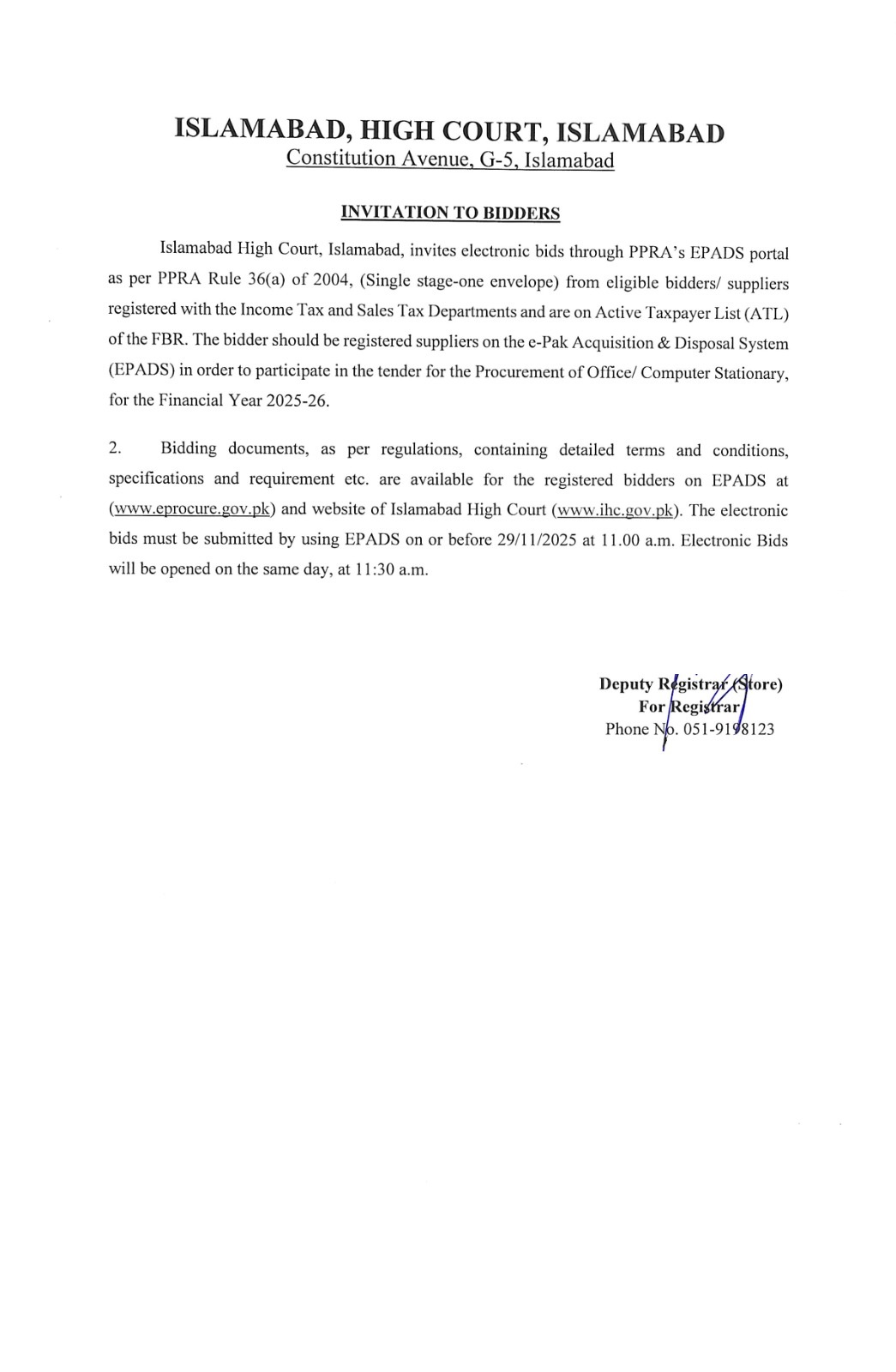 Islamabad High Court, Islamabad, invites electronic bids through PPRA's EPADS portal as per PPRA Rule 36(a) of 2004, (Single stage-one envelope) from eligible bidders/ suppliers registered with the Income Tax and Sales Tax Departments and are on Active Taxpayer List (ATL) of the FBR. The bidder should be registered suppliers on the e-Pak Acquisition & Disposal System (EPADS) in order to participate in the tender for the Procurement of Office/ Computer Stationary, for the Financial Year 2025-26.