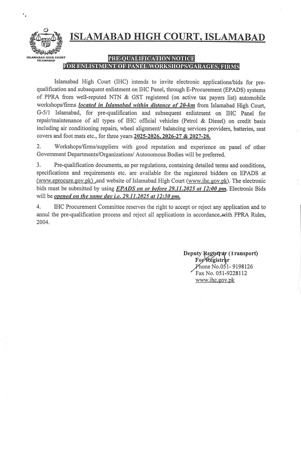 Islamabad High Court (IHC) intends to invite electronic applications/bids for pre- qualification and subsequent enlistment on IHC Panel, through E-Procurement (EPADS) systems of PPRA from well-reputed NTN & GST registered (on active tax payers list) automobile workshops/firms located in Islamabad within distance of 20-km from Islamabad High Court, G-5/1 Islamabad, for pre-qualification and subsequent enlistment on IHC Panel for repair/maintenance of all types of IHC official vehicles (Petrol & Diesel) on credit basis including air conditioning repairs, wheel alignment/ balancing services providers, batteries, seat covers and foot mats etc., for three years 2025-2026, 2026-27 & 2027-28. Workshops/firms/suppliers with good reputation and experience on panel of other Government Departments/Organizations/ Autonomous Bodies will be preferred. Pre-qualification documents, as per regulations, containing detailed terms and conditions,specifications and requirements etc. are available for the registered bidders on EPADS at (www.eprocure.gov.pk) .and website of Islamabad High Court (www.ihc.gov.pk). The electronic bids must be submitted by using EPADS on or before 29.11.2025 at 12:00 pm. Electronic Bids will be opened on the same day i.e. 29.11.2025 at 12:30 pm. IHC Procurement Committee reserves the right to accept or reject any application and to annul the pre-qualification process and reject all applications in accordance with PPRA Rules, 2004