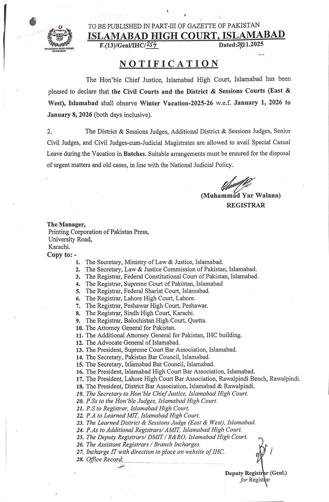 The Hon'ble Chief Justice, Islamabad High Court, Islamabad has been pleased to declare that the Civil Courts and the District & Sessions Courts (East & West), Islamabad shall observe Winter Vacation-2025-26 w.e.f. January 1, 2026 to January 8, 2026 (both days inclusive).