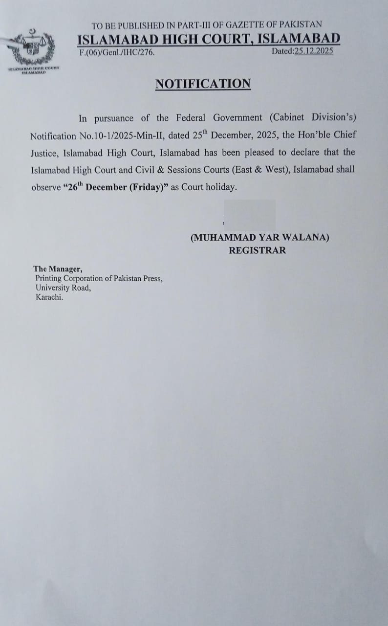 In pursuance of the Federal Government (Cabinet Division's) Notification No.10-1/2025-Min-II, dated 25th December, 2025, the Hon'ble Chief Justice, Islamabad High Court, Islamabad, has been pleased to declare that the Islamabad High Court and Civil & Sessions Courts (East & West), Islamabad shall observe "26th December (Friday)" as a Court holiday.
