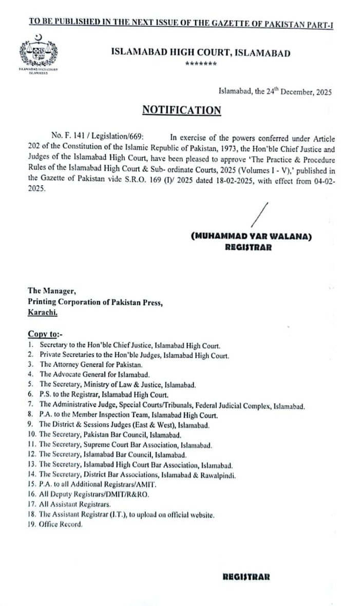 In exercise of the powers conferred under Article 202 of the Constitution of the Islamic Republic of Pakistan, 1973, the Hon'ble Chief Justice and Judges of the Islamabad High Court have been pleased to approve 'The Practice & Procedure Rules of the Islamabad High Court & Sub-ordinate Courts, 2025 (Volumes I - V),' published in the Gazette of Pakistan vide S.R.O. 169 (I)/ 2025 dated 18-02-2025, with effect from 04-02-