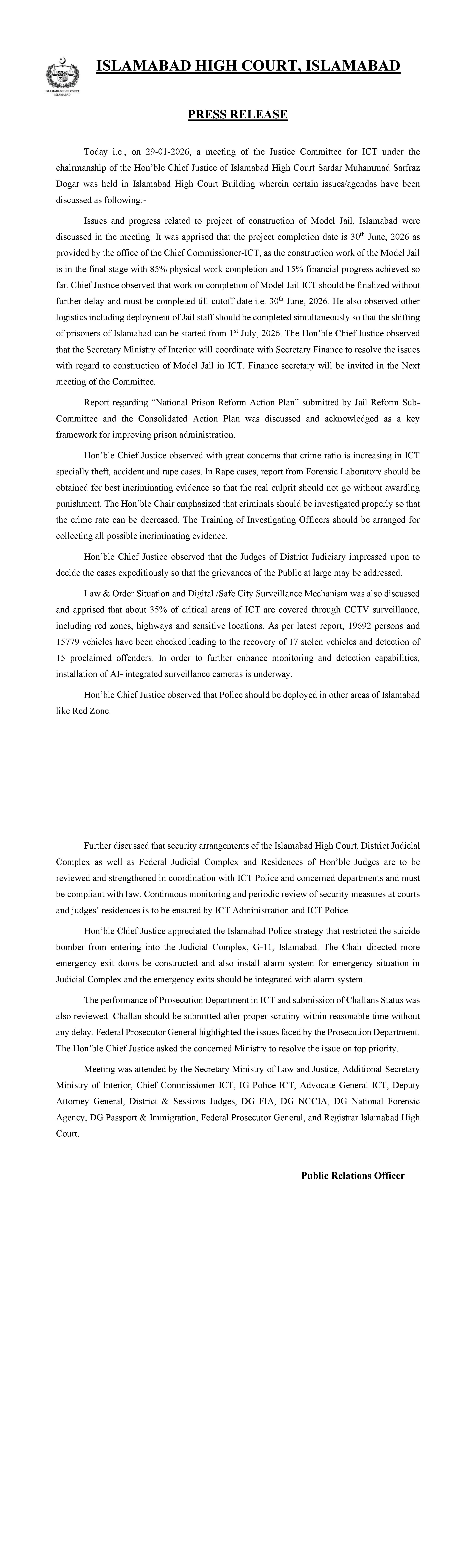 Today i.e., on 29-01-2026, a meeting of the Justice Committee for ICT under the chairmanship of the Hon’ble Chief Justice of Islamabad High Court Sardar Muhammad Sarfraz Dogar was held in Islamabad High Court Building wherein certain issues/agendas have been discussed as following:-