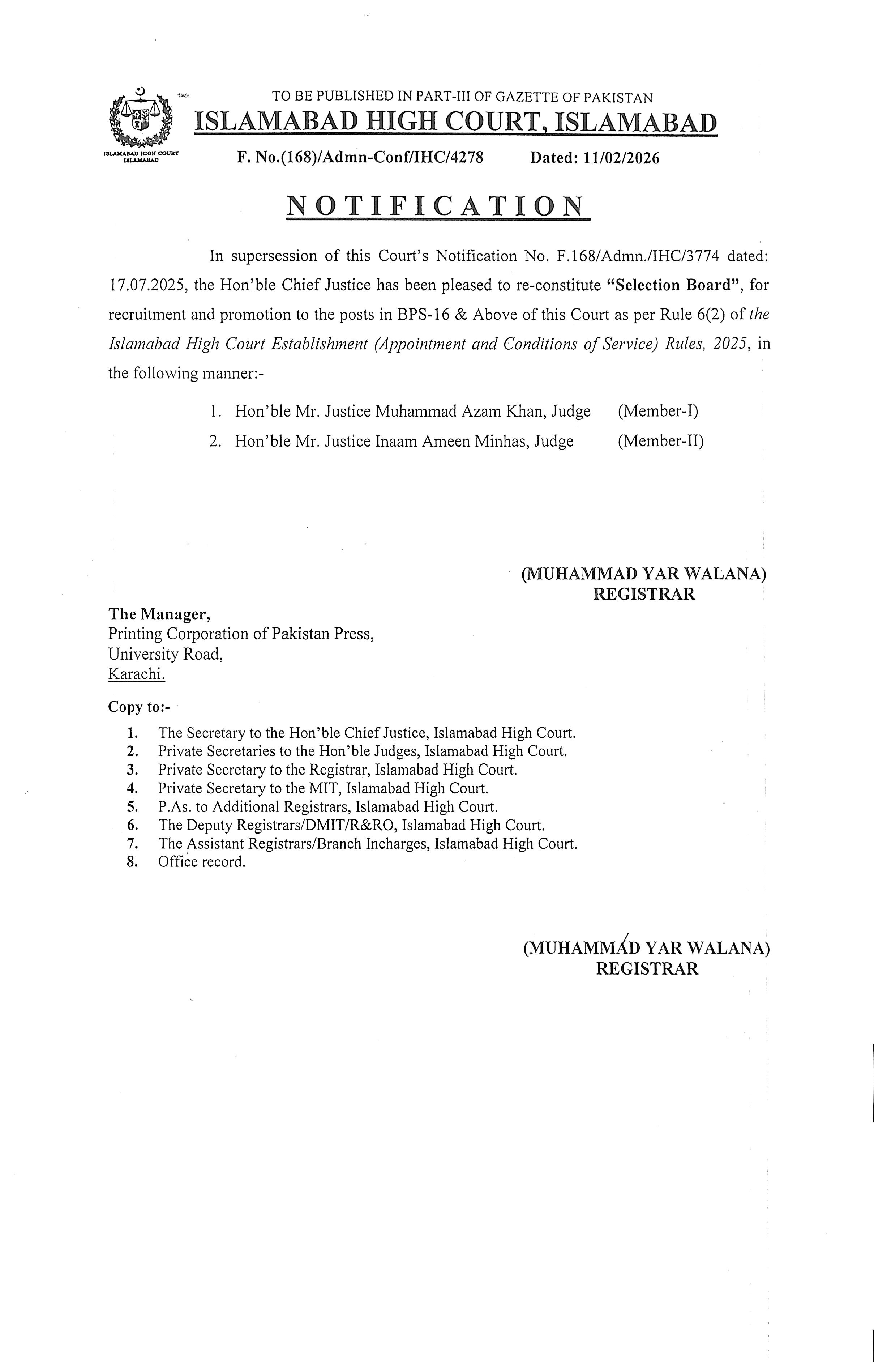 In supersession of this Court's Notification No. F.168/Admn./IHC/3774 dated: 17.07.2025, the Hon'ble Chief Justice has been pleased to re-constitute "Selection Board", for recruitment and promotion to the posts in BPS-16 & Above of this Court as per Rule 6(2) of the Islamabad High Court Establishment (Appointment and Conditions of Service) Rules, 2025, in the following manner:-