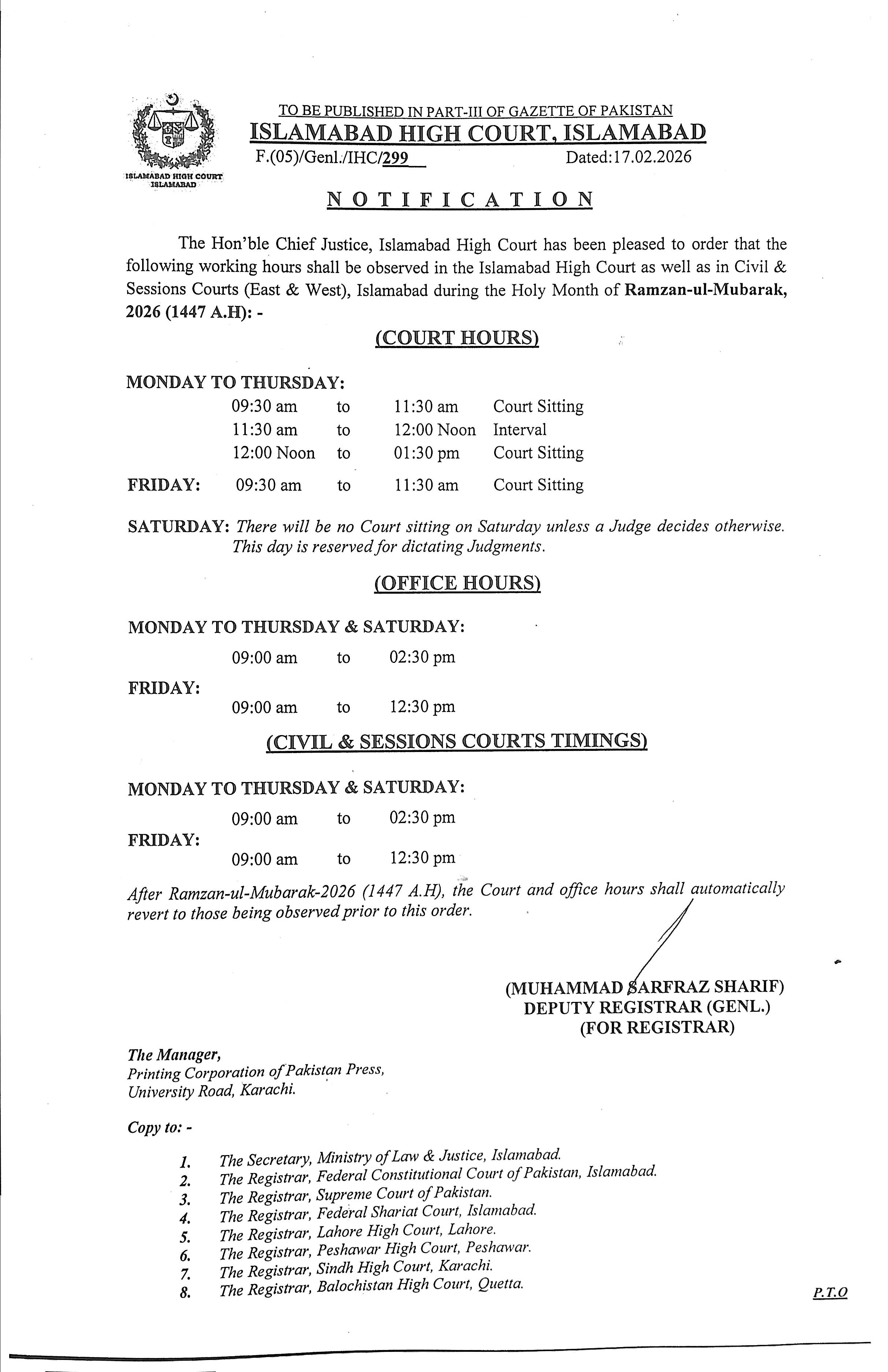 The Hon'ble Chief Justice, Islamabad High Court has been pleased to order that the following working hours shall be observed in the Islamabad High Court as well as in Civil & Sessions Courts (East & West), Islamabad during the Holy Month of Ramzan-ul-Mubarak, 2026 (1447 A.H): -